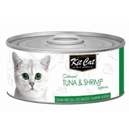 Treat your feline friend to Kit Cat Deboned Tuna & Shrimp Toppers Canned Cat Food 80gm. Made with real seafood, this delectable cat food is packed with essential nutrients for a healthy and shiny coat. Give your cat a flavorful and nutritious meal with every can.