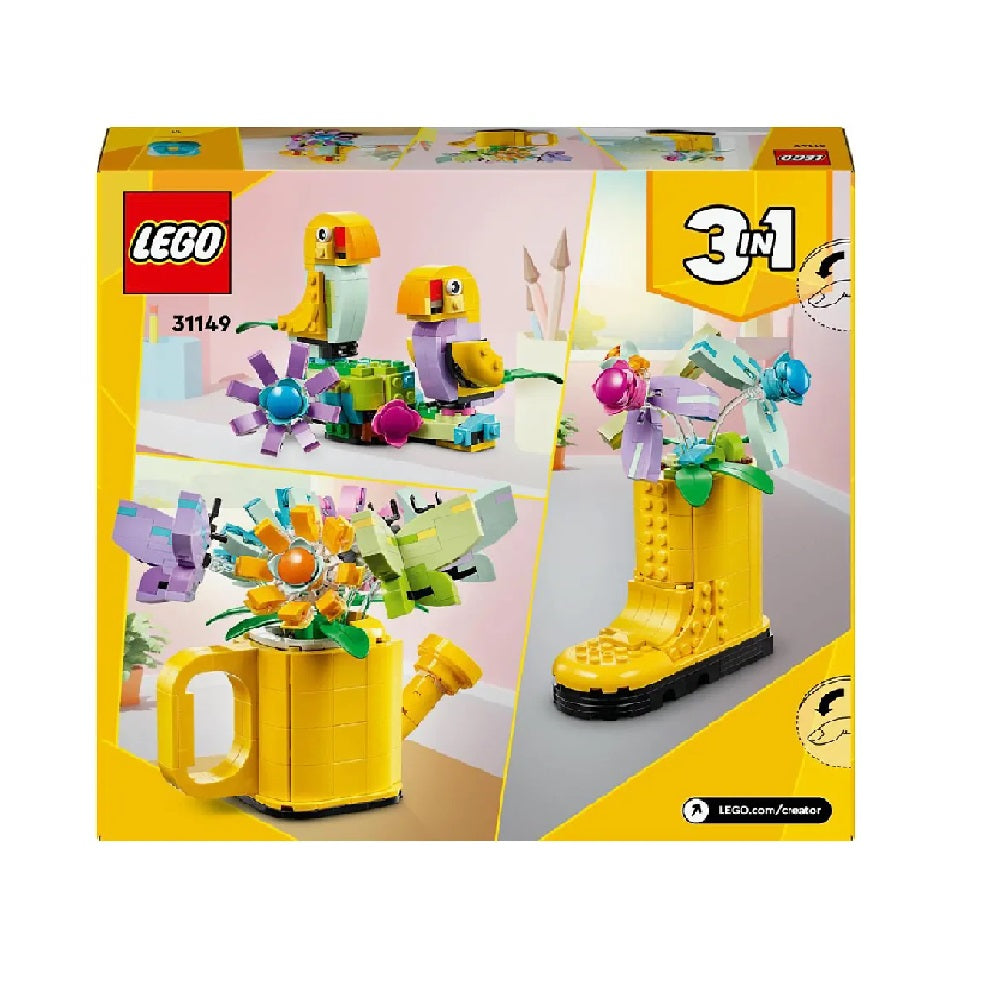 Build, rebuild, play with and display 3 colorful models inspired by nature with this LEGO Creator 3in1 Flowers in Watering Can (31149) set. It features a brick-built yellow watering can toy with a handle and spout. It’s filled with 3 flower toys with movable petals and 3 butterfly toys on transparent sticks that give the impression they are flying. Girls and boys aged 8 and up can rebuild this nature toy into a yellow rain boot filled with 3 flowers with movable petals, or 2 cute yellow toy birds on a flower-covered perch, and then display each model proudly in their room. LEGO Creator 3in1 toys make great creative gifts with 3 different model choices for kids to build in every set. From cool vehicles and amazing animals to detailed city scenes, there’s a Creator set for everyone.