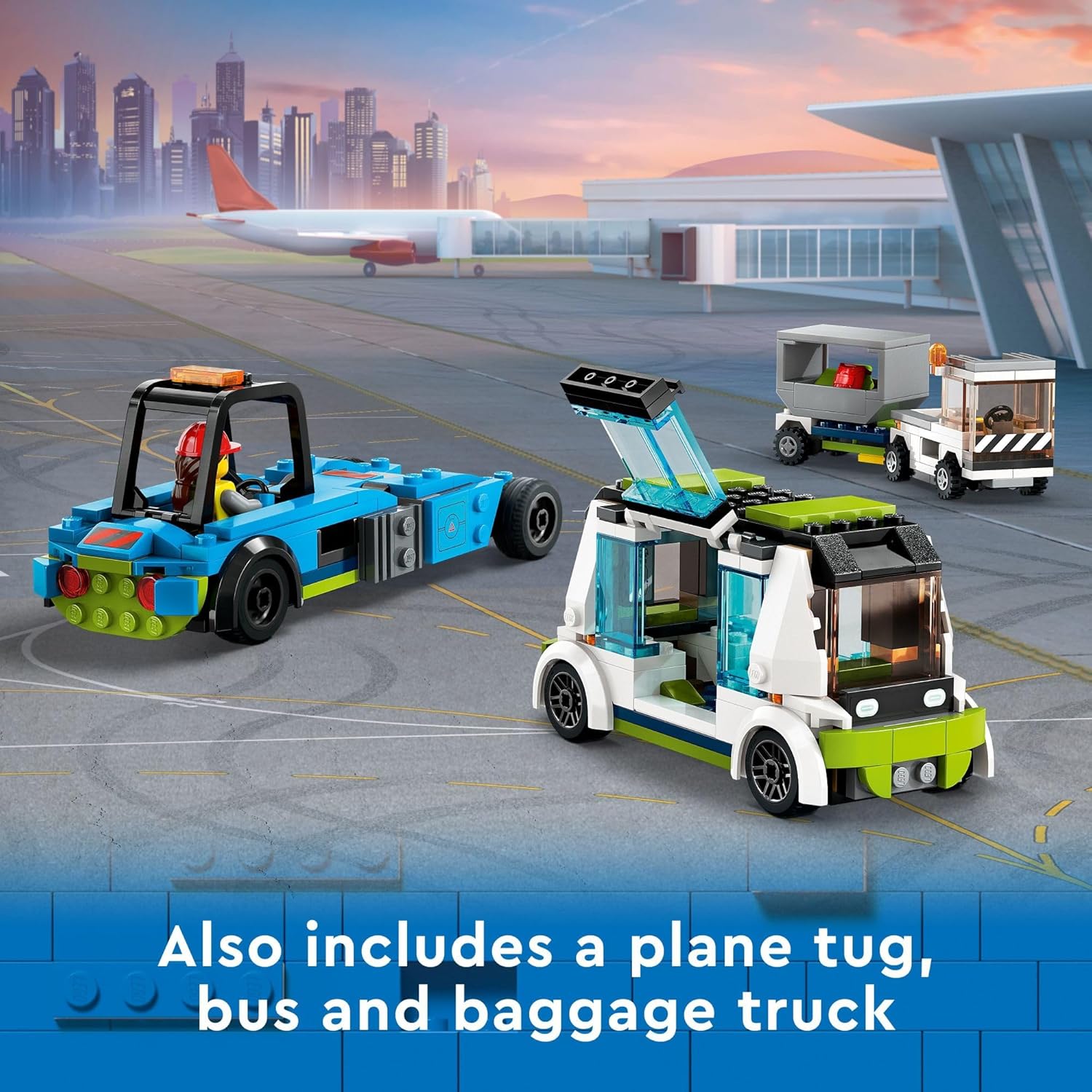 • What’s in the box? – This toy playset has everything kids need to build a Passenger Airplane, airstair, apron bus, pushback tug, catering truck and baggage truck, plus 7 minifigures