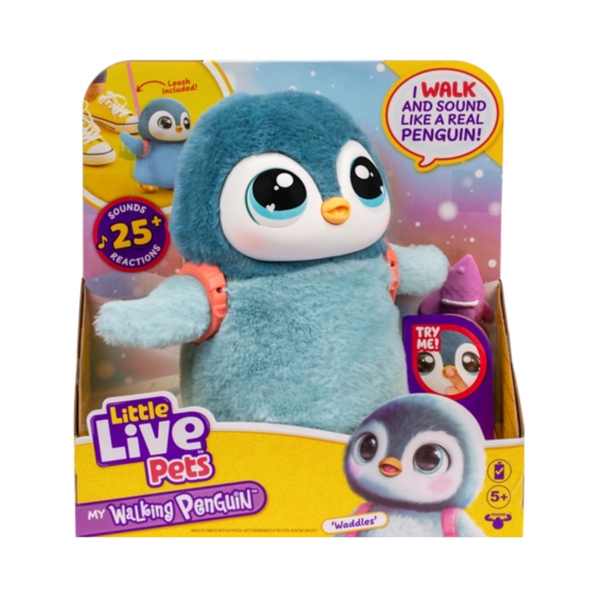 Meet Waddles, the Little Live Pets My Walking Penguin! Waddles is an incredibly lifelike and interactive penguin that children will adore. He moves and sounds just like a real penguin, with soft, fuzzy fur and flapping wings. Feed Waddles with his feeding fish and enjoy his cute reactions. He giggles, sneezes, and even makes funny sounds like farts! Waddles has over 25 sounds and reactions, making him a delightful companion. Watch as he bobs his head and flaps his wings while walking. You can also take him for a walk with his detachable leash or watch him dance to his own music tunes. Waddles comes with everything you need, including a feeding fish, an instruction booklet, and batteries so he’s ready to play right away.