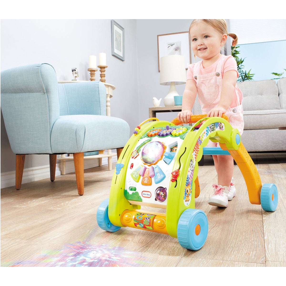 Little Tikes encourages babies to walk in a whole new light with the Learn & Play 3-in-1 Activity Walker. The walker is designed to use lights to inspire babies to get moving. When baby begins pushing the walker, fun engaging lights activate and project on the ground in front of the walker inspiring baby to keep moving. Adjustable speed control on the wheels protects beginning walkers. The walker easily converts to an activity table packed with fun and unique features. Babies can sit and play since the walker folds in half, moving the activity panel close to the floor. With over 70 activities, songs and sounds and 3 ways to play your baby will learn about shapes, colors, music and more with the Learn & Play 3-in-1 Activity Walker!