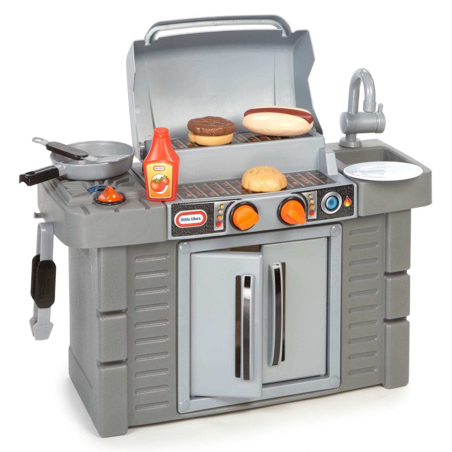 The Little Tikes Cook 'n Grow BBQ Grill looks just like a real gas grill complete with duel grill, lid, and side burners plus it has two stages to grow with your child from toddler to preschooler. Anytime is grillin' time with this toy grill barbeque set. Kids can have fun grilling indoors or take the set outside and grill.