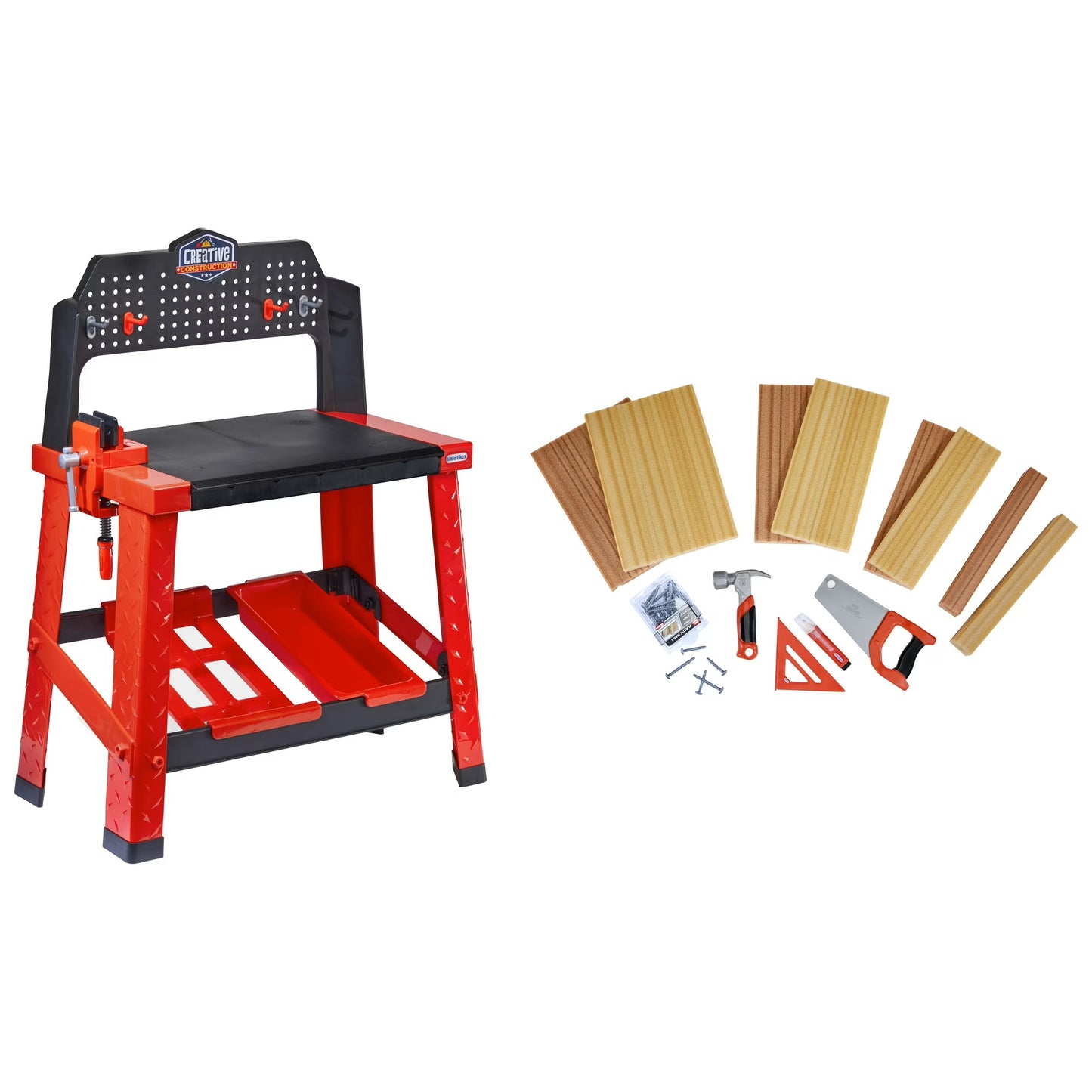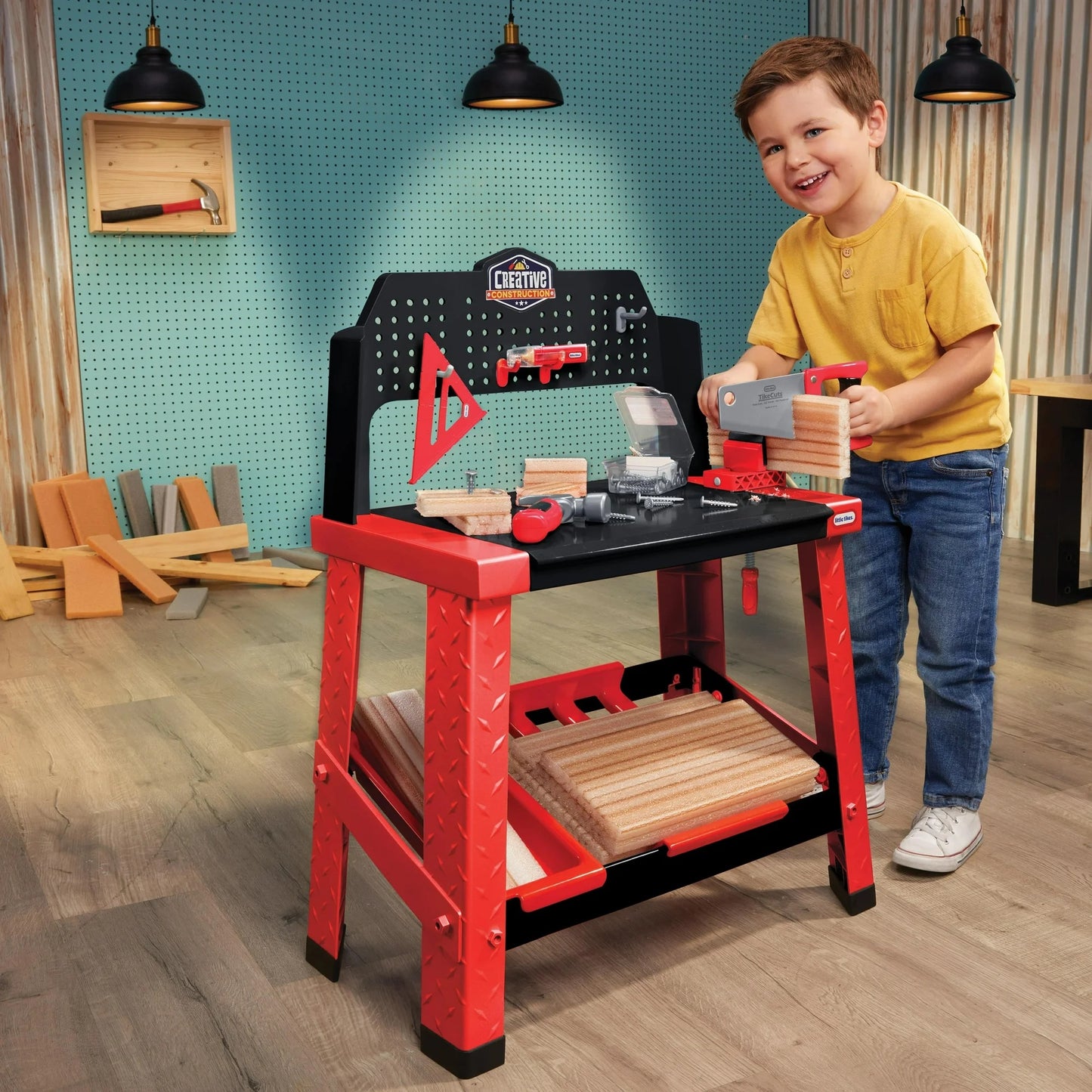 KIDS AT WORK. Boys and girls will enjoy this realistic construction kit. With a sturdy workstation, detailed tools, and foam “wood,” kids can discover a passion for building their own construction projects through hands-on play. This hyper-realistic role play set teaches kids the basics of safe construction, encouraging play to become practice and practice to become real.