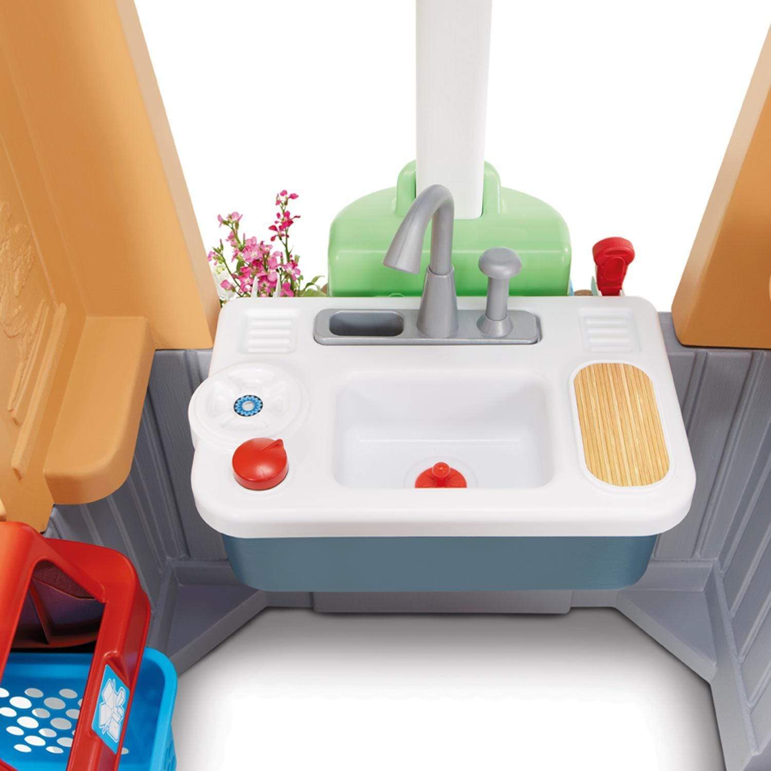 The Go Green! Playhouse helps kids learn about ways they can help the environment. What better way to do this than right in your own backyard! This playhouse features several unique, educational extras like a flower garden, water reservoir, solar light, a real working sink, plus a whole lot more! Toddlers and preschoolers will have endless hours of imaginative play in their new, educational outdoor playhouse.