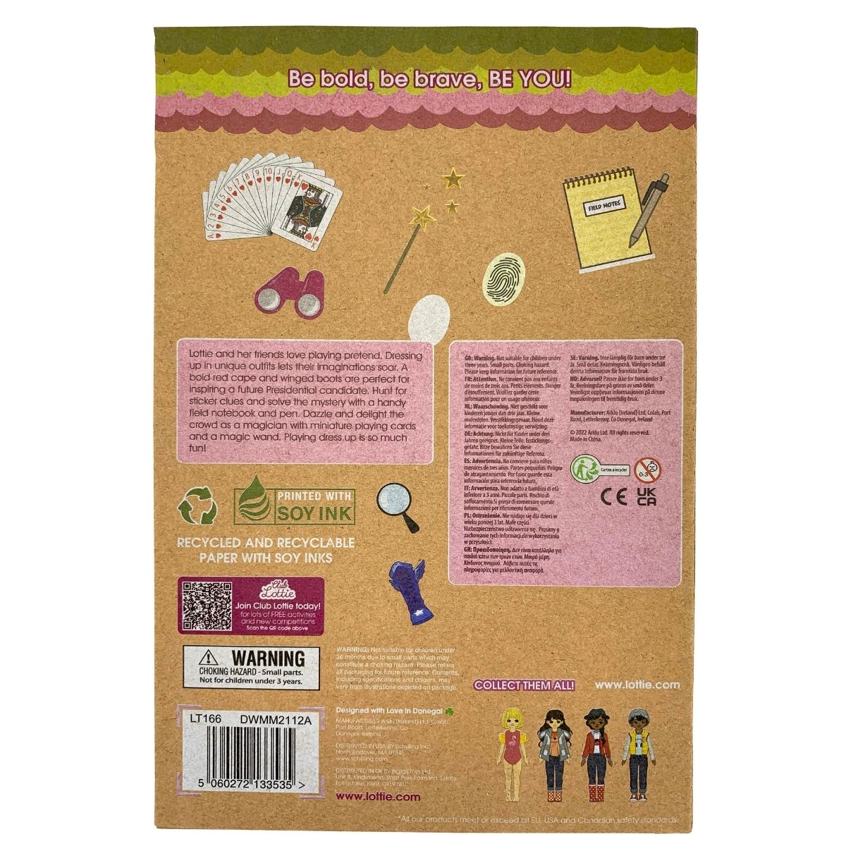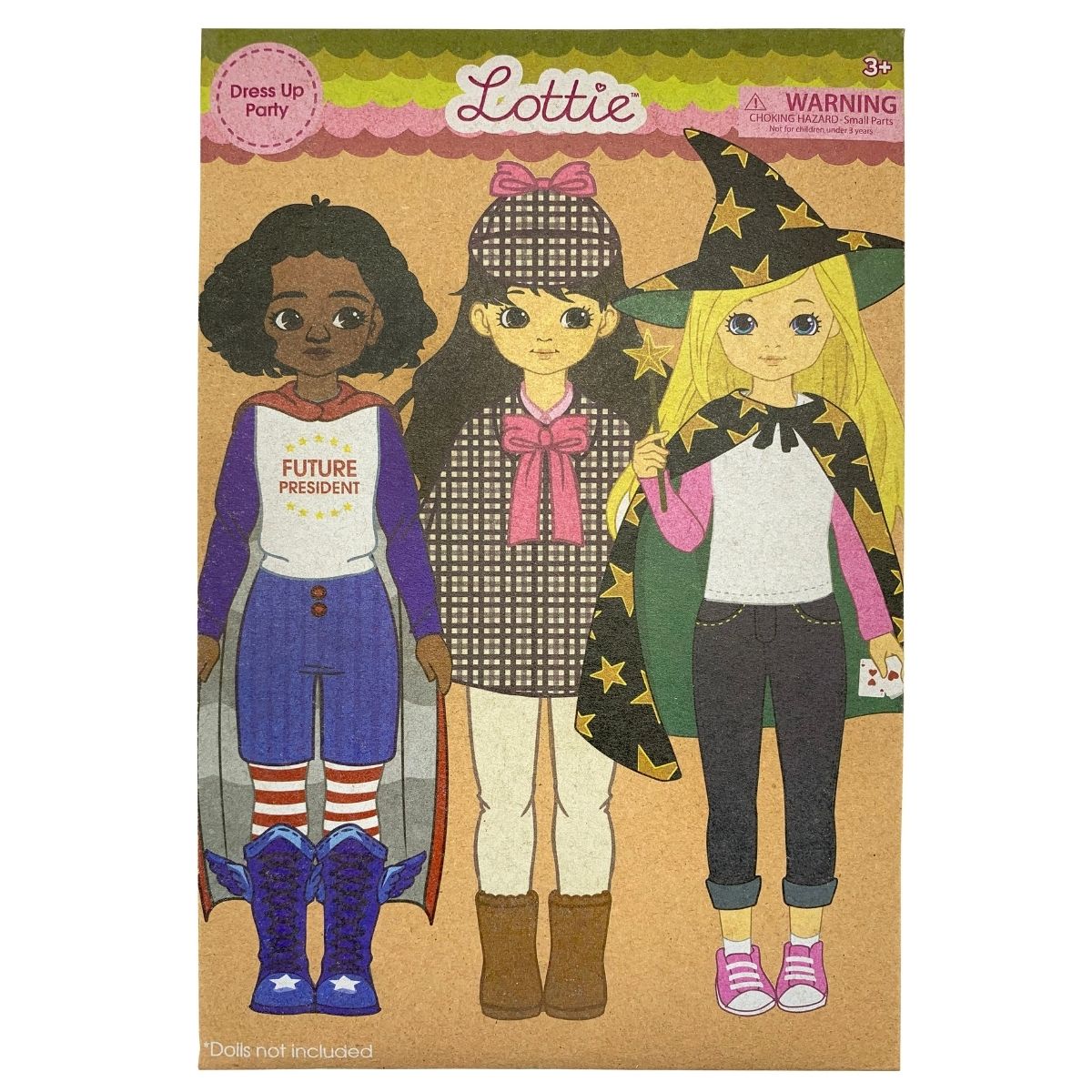 Lottie and her friends enjoy playing pretend and dressing up in unique outfits to inspire their imagination. The set includes three different outfits: one for a future Presidential candidate with a red cape, blue corduroy shorts, and winged boots, another for a mystery solver with a houndstooth cape and hat, beige cotton top and trousers, brown flocked boots, and a field notebook and pen for solving clues, and a third for a magician with a blue velvet cape and hat, denim capri trousers, pink sneakers, miniature playing cards, and a magic wand. Each outfit is designed with fun and creative details, such as pad prints, stars, and bows, and comes with all the necessary accessories to complete the look. Playing dress up is a great way to have fun and let the imagination run wild!