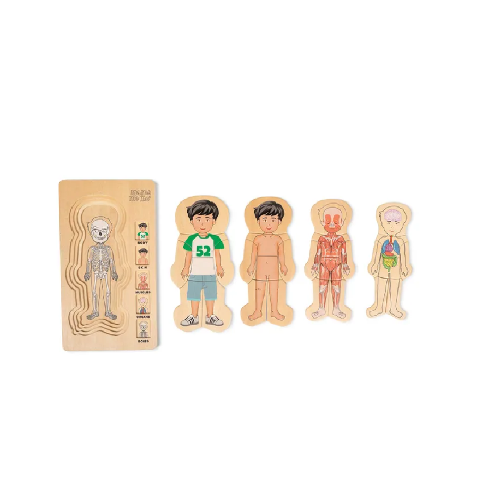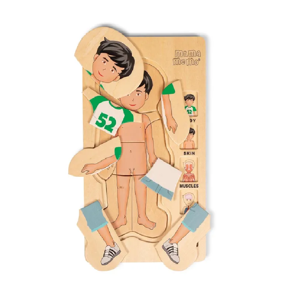 What do we look like? I mean, right under our skin. Learn more about the structure of boys' and girls' bodies and what we look like with this MAMAMEMO puzzle. The puzzle has five layers. The top layer shows a boy/girl in clothes; the second layer shows the boy/girl without clothes; the third layer shows the muscles under the skin; the fourth layer shows the internal organs; and the final layer shows the skeleton. On the back of each piece is a number, making it clear which pieces belong to which layers. , , It is an excellent puzzle for learning. The child can either play with the puzzle alone or with an adult, who can tell them all about the different parts of the body and their functions. Our wooden toys are specially made to provide entertainment and improve learning. All our toys comply with European regulations for toy safety and are CE marked.