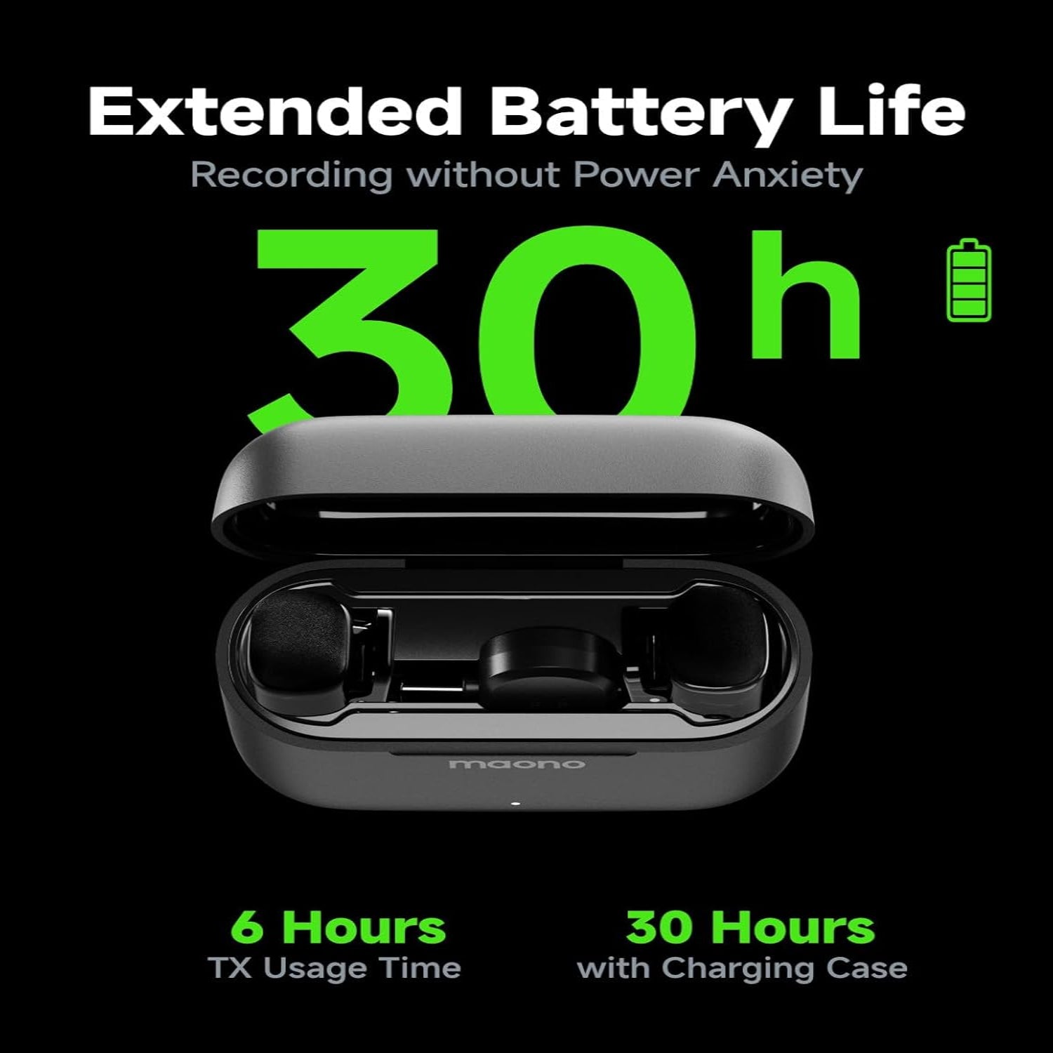 Extended 30-Hour Battery Life: With compact charging case, this small microphone can work for up to 30hours. The receiver allows to charge your device while recording, no more worrying about low battery situation