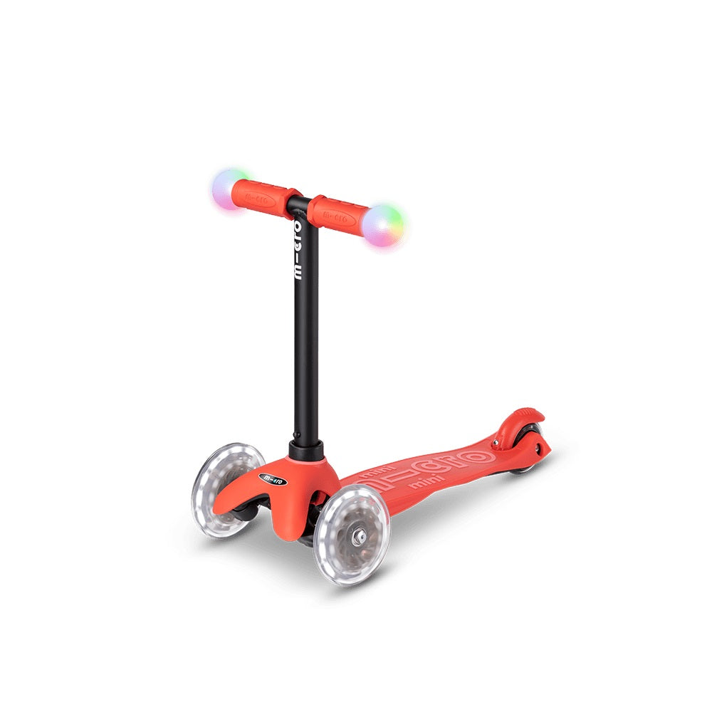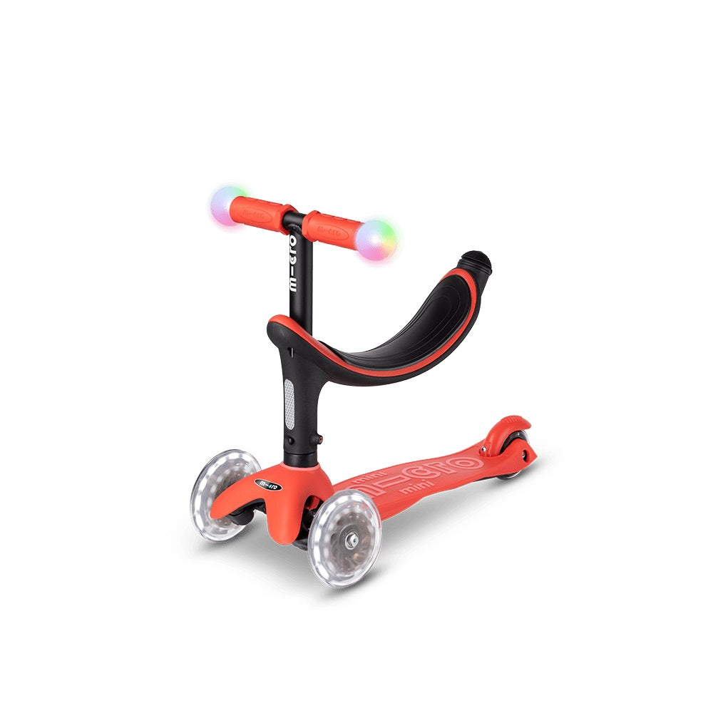 The Micro Mini2Grow Deluxe Magic LED is the perfect companion for the first years of your child's life. Thanks to its multifunctionality, it can be used from the age of 12 months and will accompany your child until at least the age of six. The innovative and ergonomic all-in-one scooter can be used in different variations: at the very beginning with seat, two footrest options and push bar for the parents, later on without push bar, as a mix between balance bike & scooter and finally as a classic Mini Micro Deluxe with magic LED light bulbs on the handlebar and LED moon wheels. The push bar for the parents can be used vertically in addition to the standard horizontal position. This means that only one hand is needed for pushing, thus protecting the wrist and muscles. In addition, the Micro Mini2Grow Deluxe Magic LED convinces with a height-adjustable handlebar, a patented lean-to-steer mechanism and an extra grippy footboard.