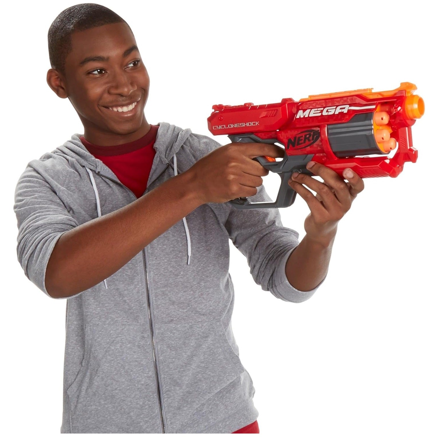 Your battles are about to get a whole lot bigger – Mega bigger! The CycloneShock blaster has the same high performance as other N-Strike Elite blasters, but it features bigger darts engineered to fire farther than ever! The rotating drum lets you fire 6 Mega Darts without reloading! Hit the battlefield – and targets up to 90 feet away - with the rapid-firing Mega power of the CycloneShock blaster!