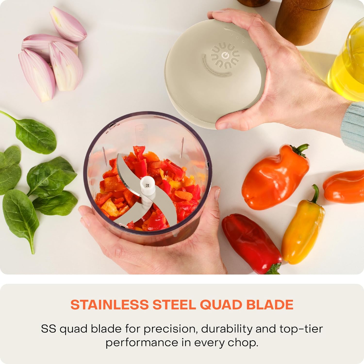 • STAINLESS STEEL QUADBLADES – These durable blades make quick work of anything from vegetables to herbs, ensuring efficient chopping every time.