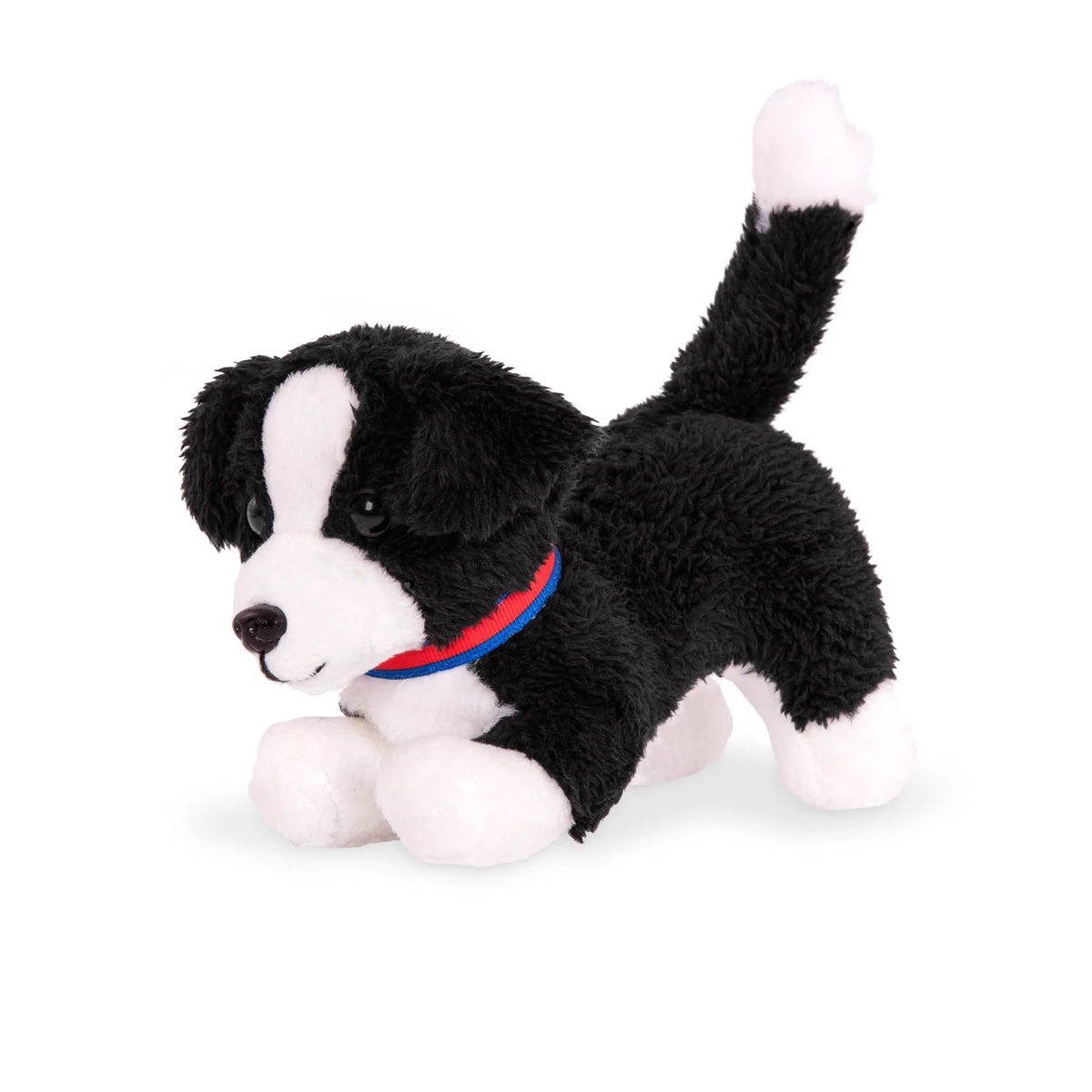 Travel, snuggle, and embark on fun adventures with the 15 cm Our Generation Border Collie! This plush dog has posable legs, so your pup can learn to sit, lie down, and shake paws! Is it time for a trip? Clip the attachable leash to the collar and explore the neighborhood to meet more friendly pals! This lovable pet companion has super soft black and white plush fur, and it's just the right size to teach your dolls how to care for their puppy. (Dolls sold separately)