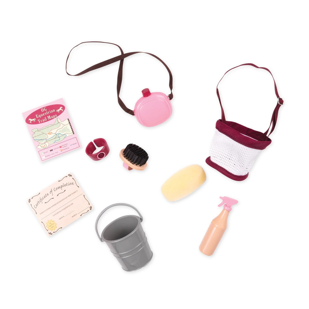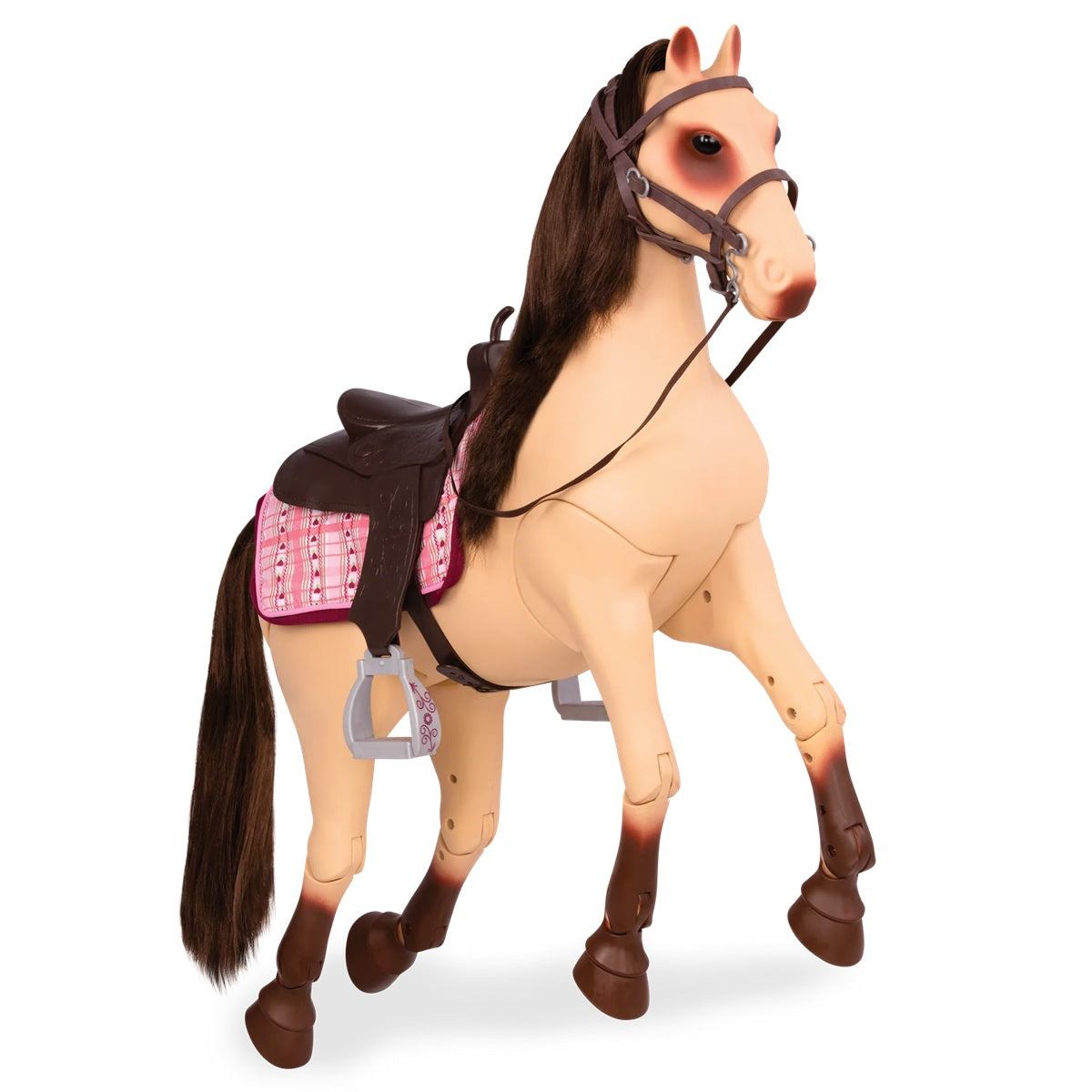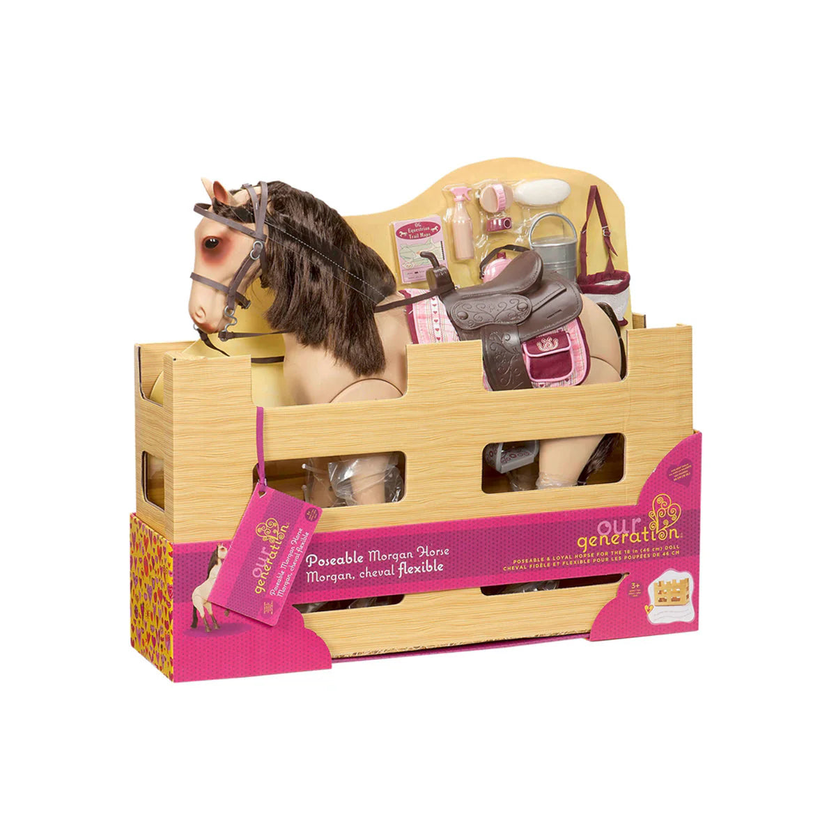 Take a trail ride and do some show jumping with the Our Generation Posable Morgan Horse for 18-inch dolls! Climb onto the classic brown saddle with an adorable pink plaid blanket underneath, take hold of the brown reins, and giddy up! This friendly horse can bend its legs to take your dolls on lots of galloping adventures – just follow the map and enjoy the beautiful countryside! When it's time to head back to the stable, use the brush and spray bottle to help your equestrian friends groom their horse to keep her happy and healthy. Horseback riding days are the best! (Dolls sold separately)