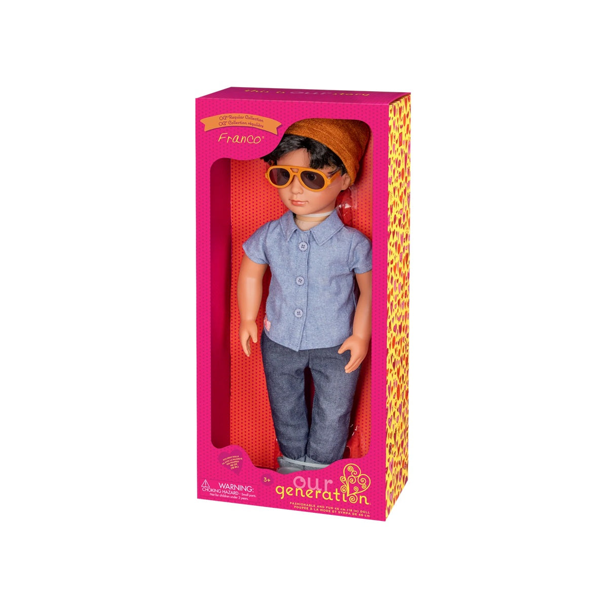 This 46cm youngster just moved to the neighbourhood and he's ready for an adventure! Franco has dark-brown eyes and short, parted black hair with his signature beanie. This handsome boy loves being outside and is always excited to make new memories with friends. He arrives in a casual outfit that features denim-style pants, a crisp, blue buttoned-down shirt, and a pair of sunglasses to enjoy long afternoons in the sunshine. You can even put his hat on one of your other 46cm besties while you give Franco a new hairstyle, or sit back and tell him all of your funny stories and what you plan on doing together – he's an excellent listener! Which of your favourite dolls will you introduce to Franco first?