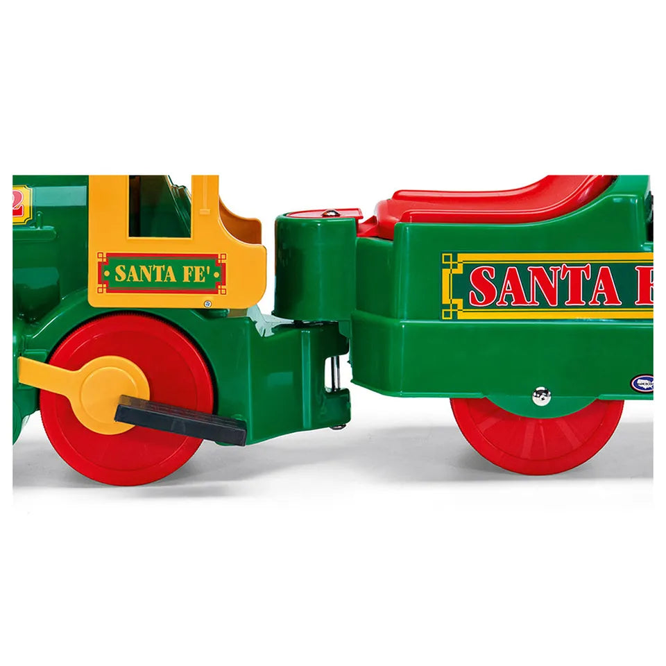 Your child's first electric train to ride on! All aboard for lots of fun with the Santa Fe Train! The 6V/4.5Ah/25Wh electric train for children 2 and up to drive with or without tracks. 6-volt rechargeable battery and charger included.