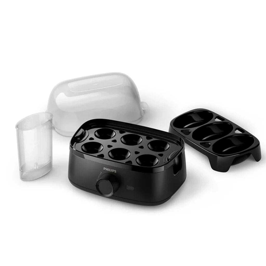 The egg cooker comes with a poached egg accessory tray. Easy to use and clean, simply slot on the tray to come up to 3 delicious poached eggs at the same time.