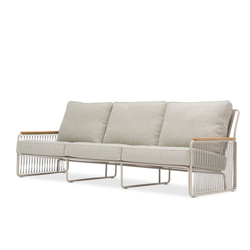 Introducing the Riva High Seater Sofa, a perfect fusion of mid-century modern and contemporary design. The elegant aluminum frame features a mocha-colored rope, providing both style and comfort. This sofa set is complemented by a matching coffee table and side table, creating a cohesive and inviting outdoor setting ideal for entertaining or relaxing.