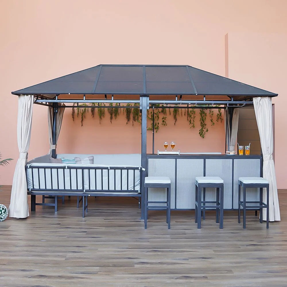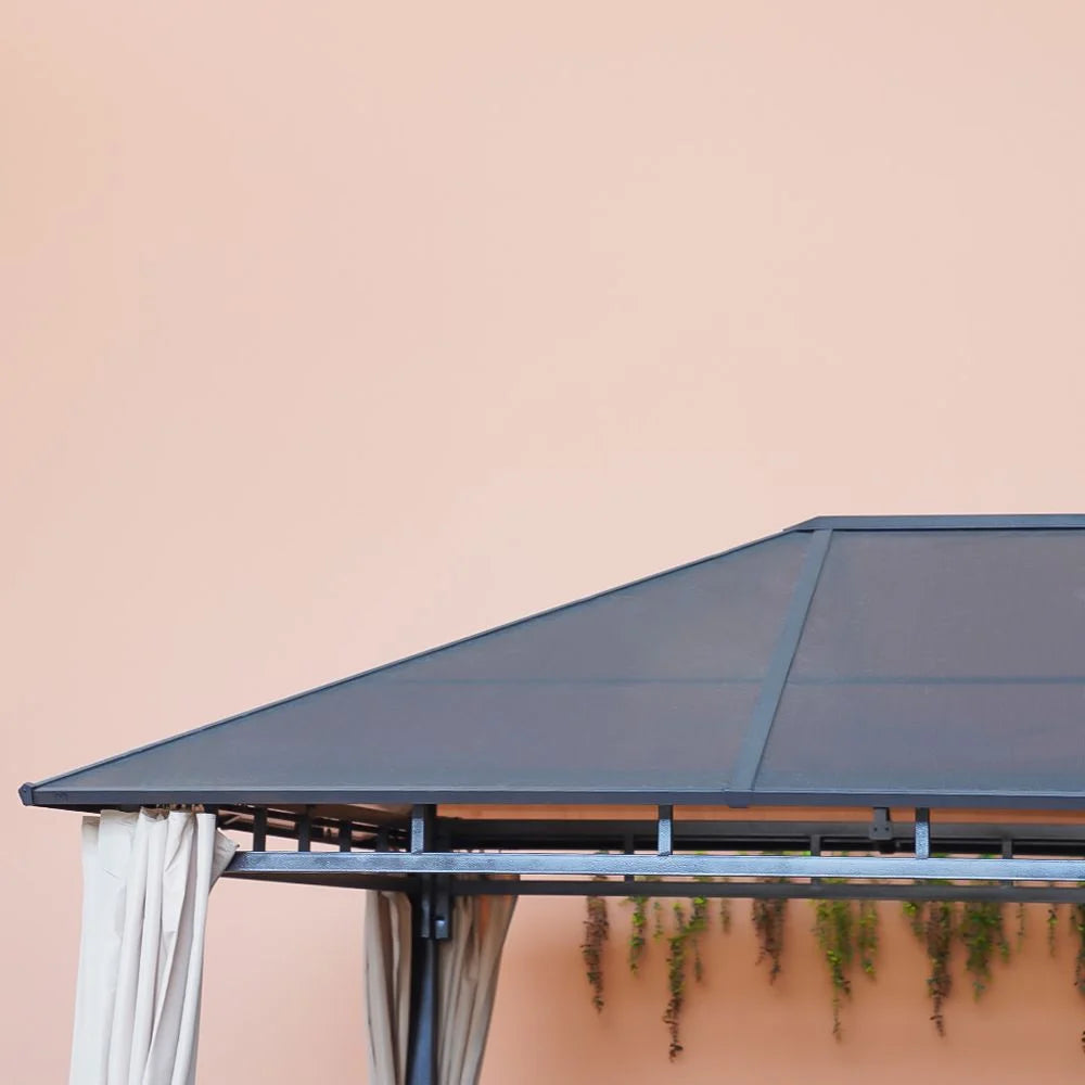 The gazebo’s high-quality polycarbonate roof adds elegance and durability, allowing light to pass through for a brighter ambiance in the evenings. Its construction ensures resilience against various weather conditions, making it a durable and versatile addition to your outdoor space.
