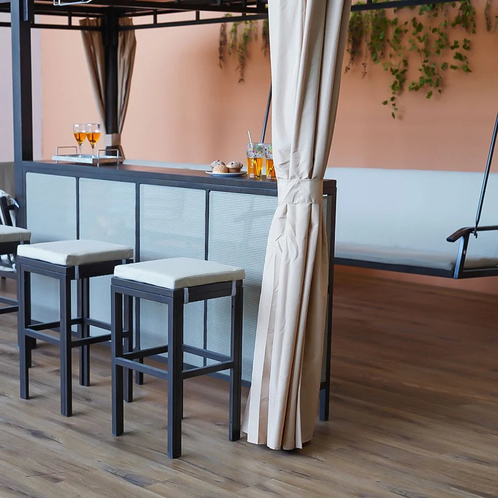 Description: The Romero All-In-One Gazebo offers a complete package for all your outdoor entertainment needs. It includes an iron gazebo with a 180g single curtain, a bench, a table, a two-seater swing chair, a bar stand, and three high chairs.