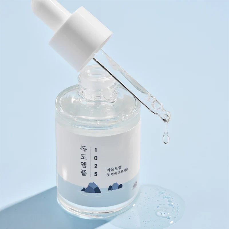 The ROUND LAB 1025 Dokdo Ampoule is a gel water type ampoule that moisturizes deeply into the skin. This ampoule contains the combination of deep sea water, low molecular hyaluronic acid weight, and panthenol. These ingredients work together to keep the skin soothed, hydrated, and moisturized.
