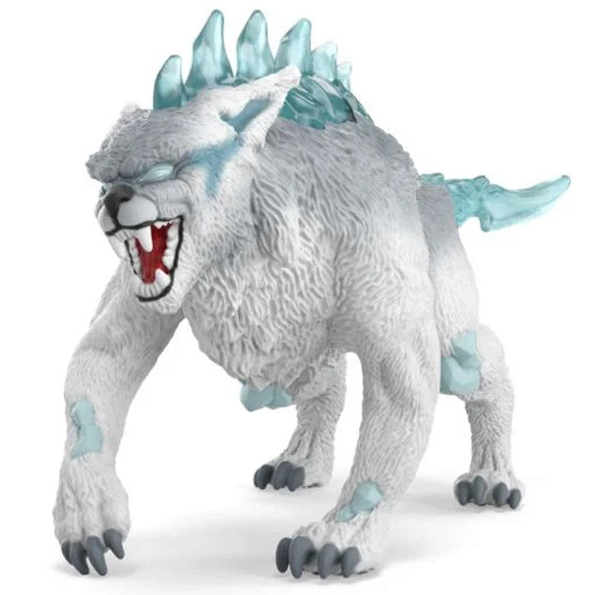 It features sharp fangs, powerful paws, and a crest of ice crystals on its back.
