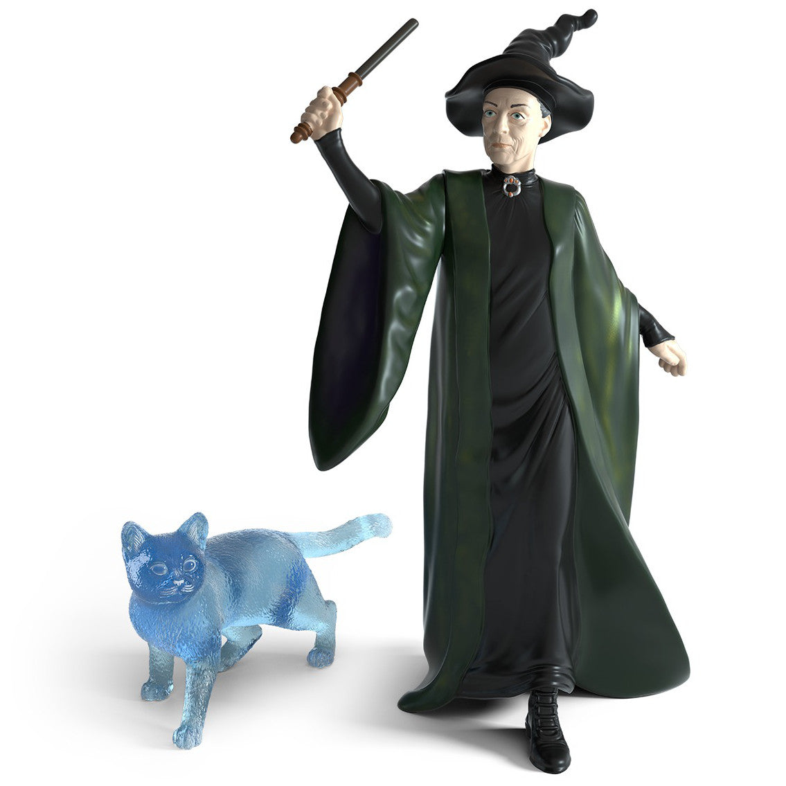 The Wizarding World Professor McGonagall with Patronus figurine from Schleich is a magical model duo of the Transfiguration professor and her protective cat. Professor Minerva McGonagall is sculpted standing with her right arm raised, wand ready, wearing her characteristic green and black robes and tall black witches hat. Her blue, translucent cat patronus helps to ensure you can play at an imaginary Hogwarts and stay safe from the dementors.