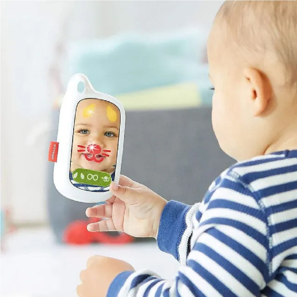 Baby’s first selfie! Thanks to its mirrored surface, this adorable toy phone encourages self-recognition at playtime. Three light-up face filters are fun for little ones to explore—from goofy glasses to cute dog ears and more. Awesome sound effects, including barks and meows plus cheerful tunes add to the fun!