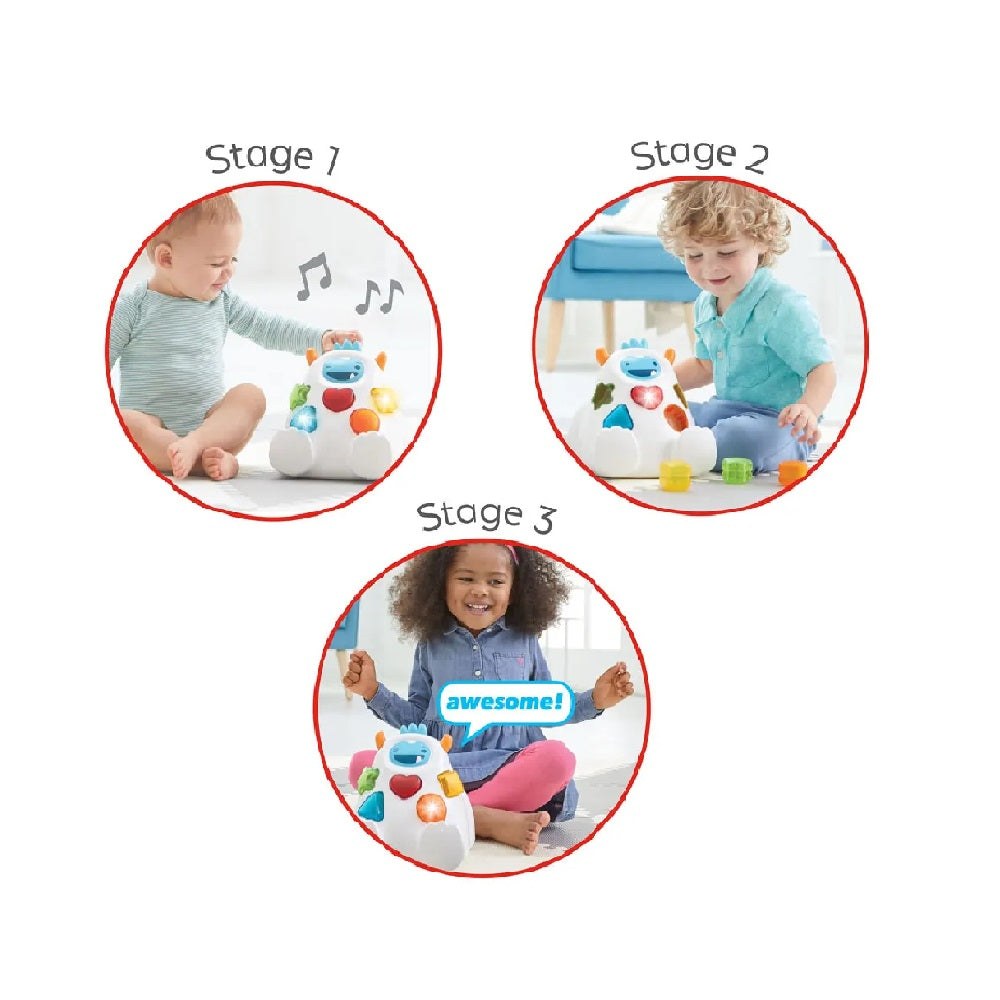 - Stage 3 (Game Mode): Yeti encourages child to find specific shapes and colors. Once all shapes are correctly placed, lights, music and encouraging phrases reward baby