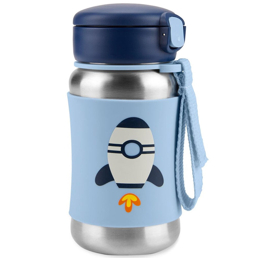 Fill their sipping with epic style! Featuring cool designs that let little personalities shine, our stainless-steel water bottle helps keep drinks cool on-the-go. The pop-up lid keeps the flexible straw clean, while the non-slip silicone sleeve protects little hands from cold surfaces. Grab it by the strap & go!