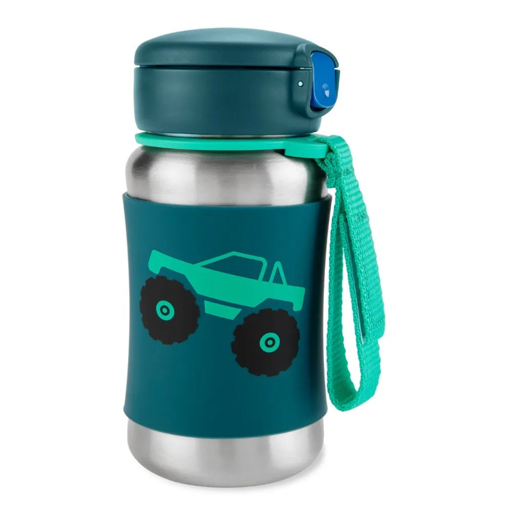 Fill their sipping with epic style! Featuring cool designs that let little personalities shine, this stainless steel water bottle helps keep drinks cool on-the-go. The pop-up lid keeps the flexible straw clean, while the non-slip silicone sleeve protects little hands from cold surfaces. Grab it by the strap & go!