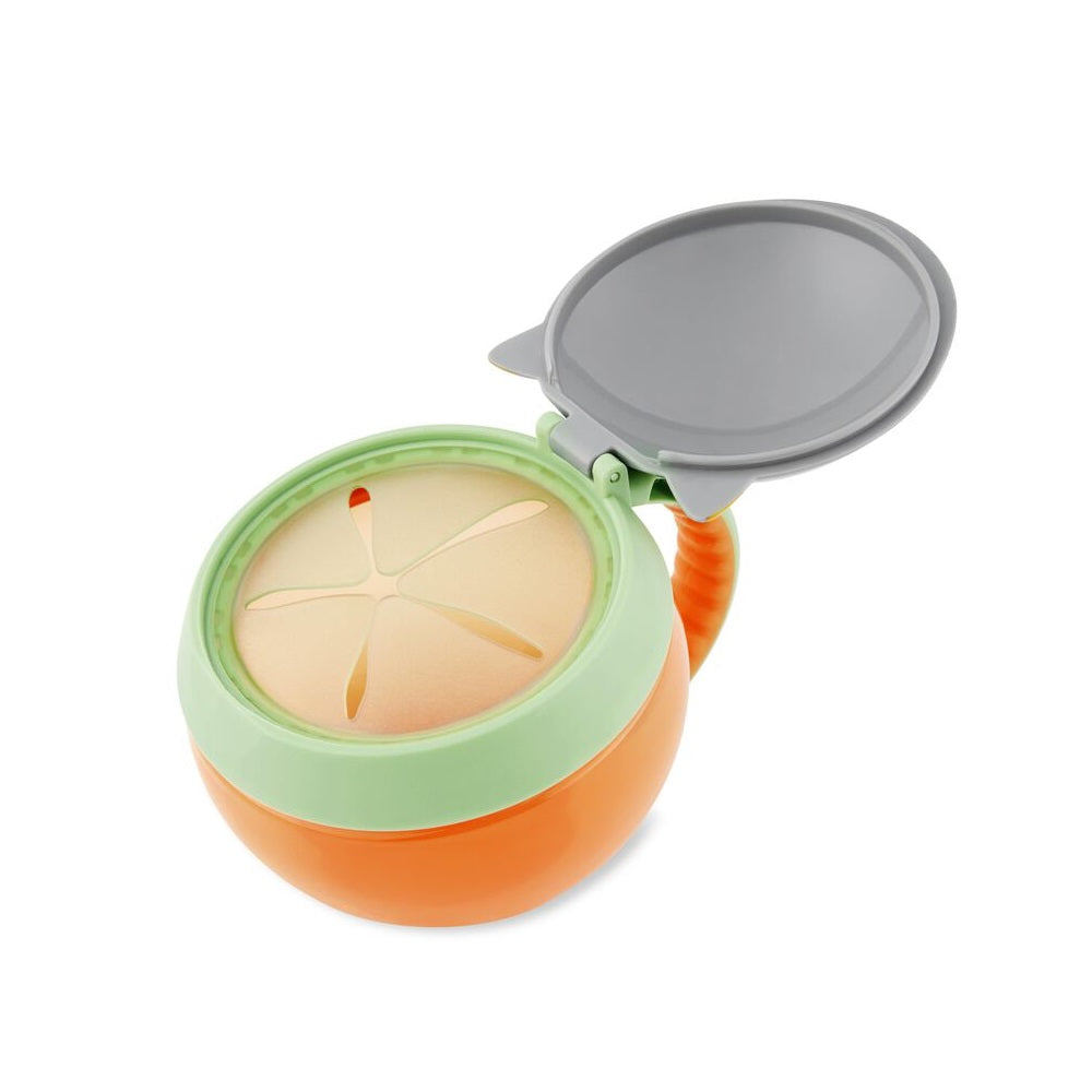 Perfect for toting munchies, this cute cup encourages independent snacking without the mess. The easy-grip handle is sized just right for little hands, and the snap top lid ensures food stays fresh. The flexible inside opening keeps snacks from spilling out - even if it's tipped over. With two lids there's less mess and mom's bag stays crumb-free!