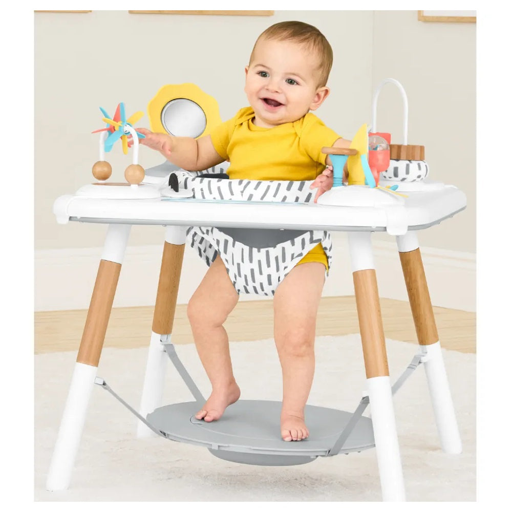 Skiphop nature-inspired activity center sparks baby's natural curiosity while encouraging self-directed exploration and sensory play. Beautifully crafted with sustainably-sourced natural wood accents, it's packed with over 25 developmental activities, five moveable toys for customized play, and the unique Discovery Window that helps teach cause & effect. The three-stage grow-with-baby design also features a 360-degree rotating seat for baby to swivel and bounce, then converts to cruising mode for new walkers and finally becomes a toddler play table with a handy bin to store crafts and supplies.