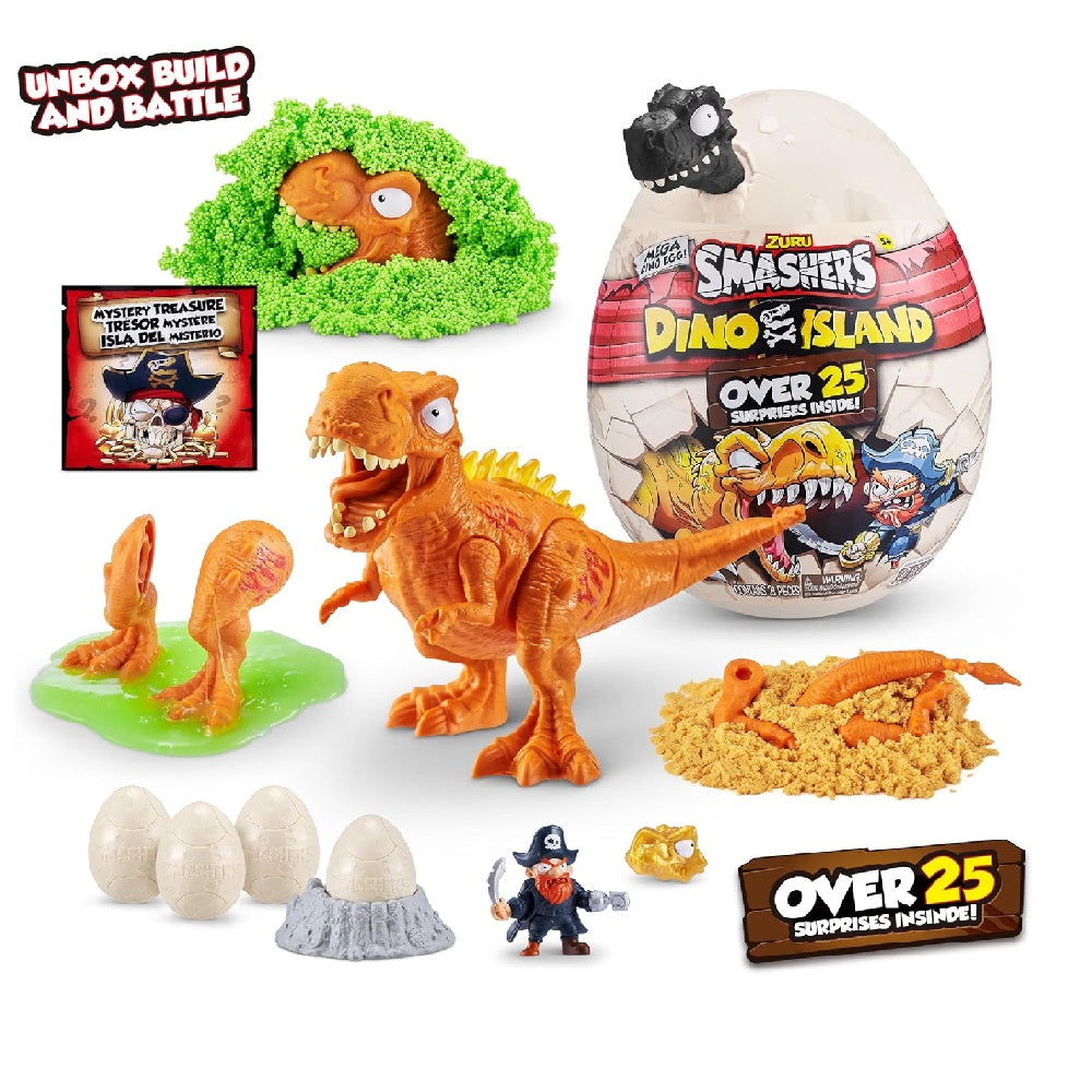 Smash your way to an epic prehistoric adventure with Smashers Dino Island Mega Egg. SMASH your egg to smithereens to uncover the 25 hidden surprises inside this action-packed egg! Search through cotton candy foam, squishy sand and super stretchy slime for your dino pieces! Along the way, look out for a pesky pirate figurine and 4 epic smashers mini eggs that hold exclusive characters! Look closely to uncover the 4 Dino Island stickers and new golden dino skull pencil topper amongst your treasures. Construct your dino parts to discover which Smash-o-saur you’ve discovered! Will you find the mighty T-Rex or stealthy Stegosaurus? What arrrgh ye waiting for! Get smashing to discover your new dangerously epic Smashers Dino!