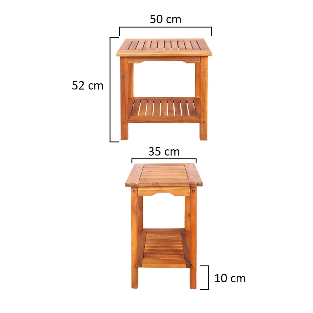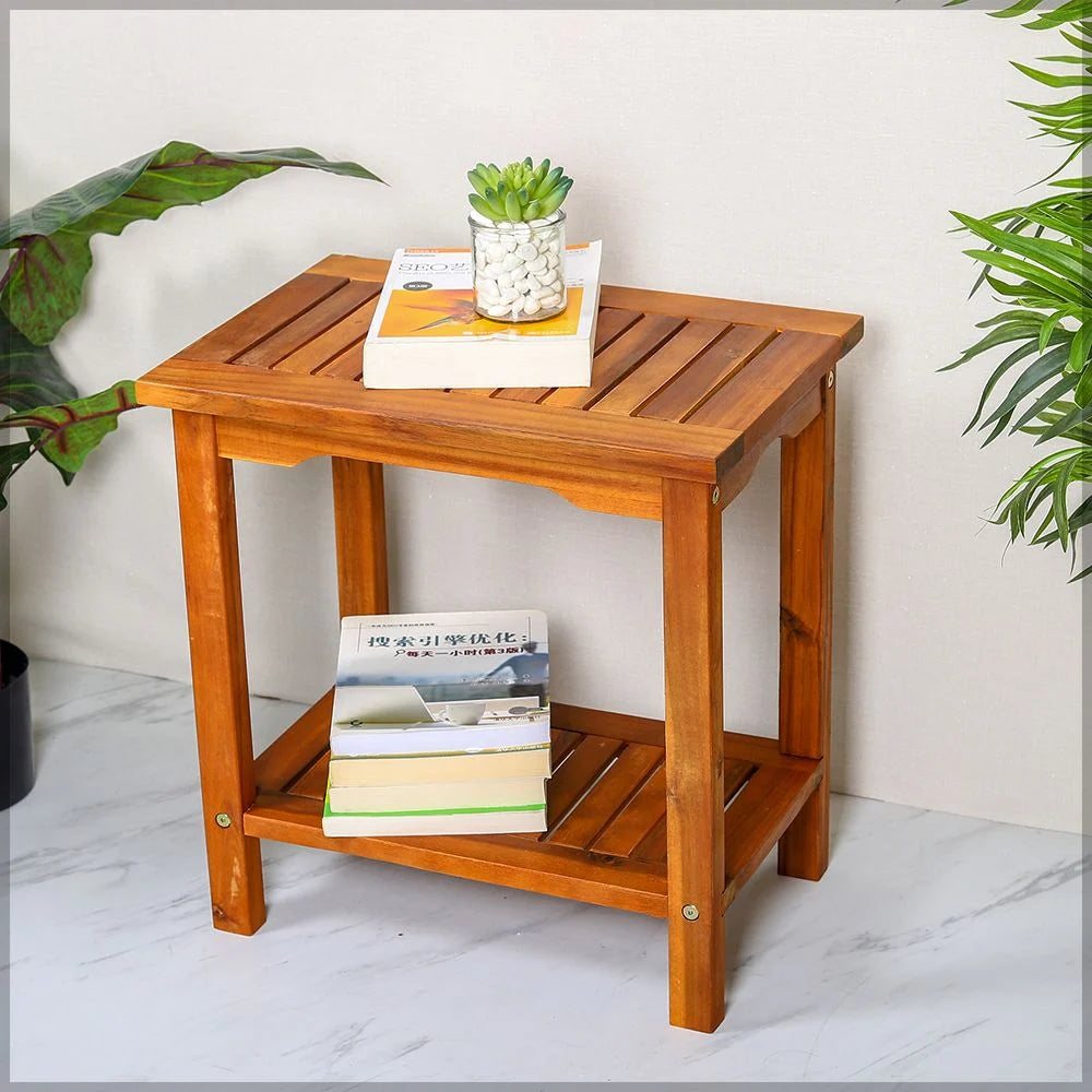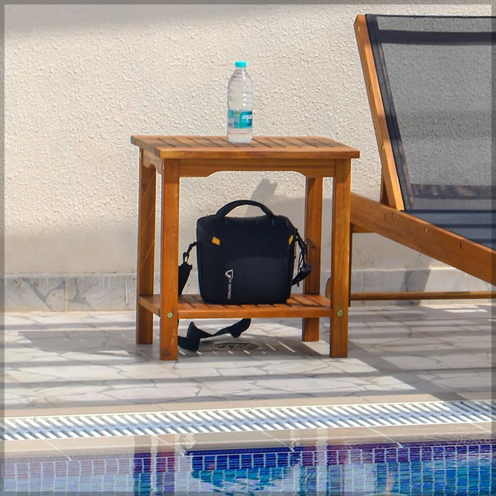 Expertly crafted with solid acacia wood, this 2-tier table and bamboo stool combo from Yatai is perfect for shaving, showering, or as a foot rest. Its portable design makes it ideal for use by the pool or anywhere you want to relax. Durable and stylish, it's a must-have for any outdoor or indoor setting.
