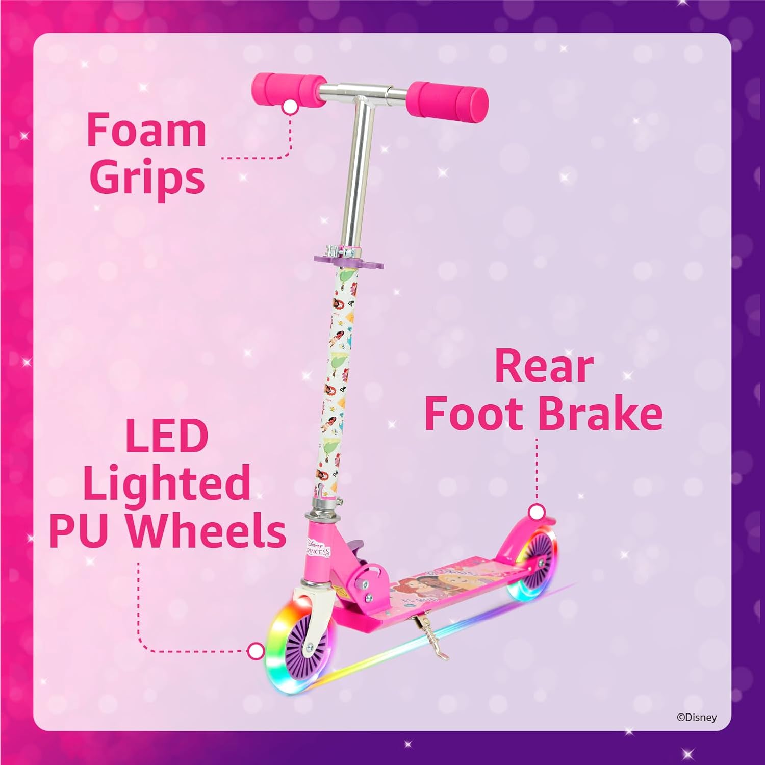 KIDS SCOOTER WITH FUN DESIGNS AND COLORS with LED LIGHTS - Choose from a wide variety of girls and boys style scooters, from princess to super hero and in multiple colors like pink, blue, purple and red, especially for evening rides down with LED super lights perfect for a sidewalk with adult supervision.
