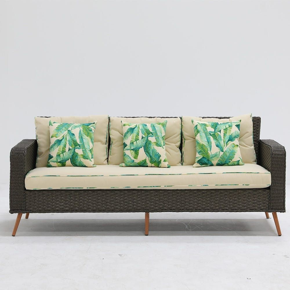 Add some tropical charm to your outdoor area with the gorgeous Stella three-seater that features subtle cream-colored fabric upholstered cushioned seating and a backrest with tropical print throw pillows that make the couch absolutely picture-perfect. We also love the rattan-weaved frame that is sure to look amazing in any outdoor space.
