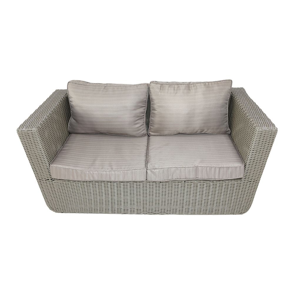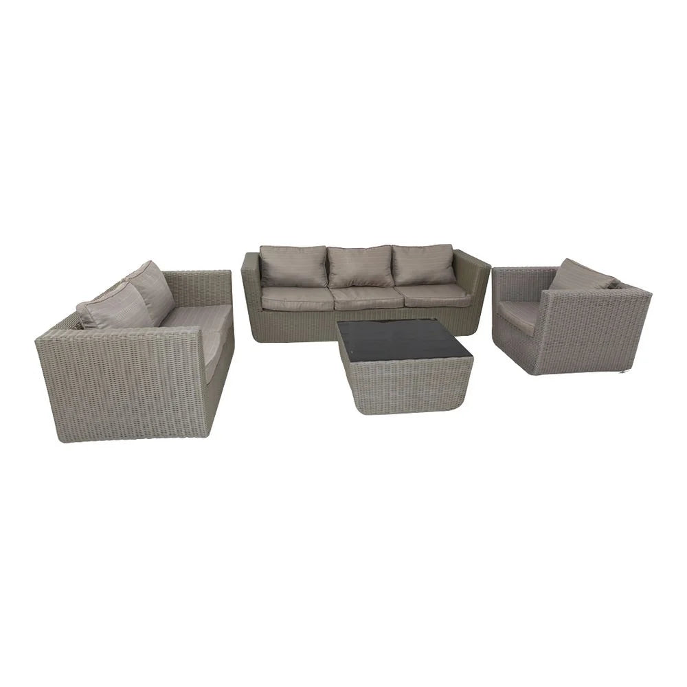 Designed to make a good impression with its compact size, this sofa set offers exceptional comfort and encourages you to enjoy the outdoors every day. The frame is constructed from Mild Steel with an 18 Gauge thickness (1.6 mm wall thickness) and is painted with Epoxy Paint to prevent corrosion. It features heavy-duty build quality capable of supporting a maximum seating weight of up to 110 KG per seat. The UV-protected, high-quality rattan used is resistant to sun heat and rain. The set includes a three-seater, a two-seater, a one-seater, and a black glass table, along with cushions.