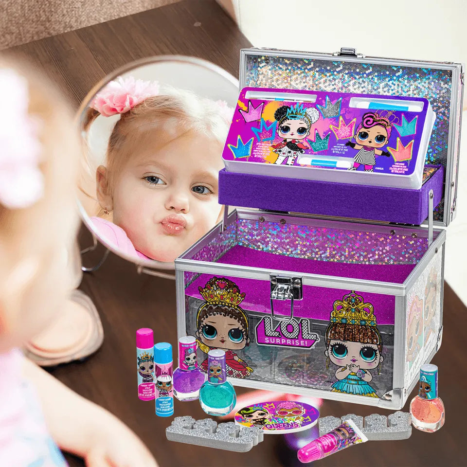 Set Includes: 1 x Acrylic train case, 1 x 3-well, cotton candy flavoured, lip gloss compact, 3 x Non-toxic, peelable nail polish: green glitter, orange glitter, and purple glitter, 1 x Cotton candy flavoured lip gloss, 1 x blueberry flavoured lip balm, 1 x Strawberry flavoured lip balm, 6 x Different applicator brushes, 1 x 3-well eye shimmer compact: silver glitter, neon rose glitter, and teal glitter, 1 x 2-well cheek shimmer: pink and turquoise, 1 x LOL character nail file, and 2 x Glittery silver toe spacers.