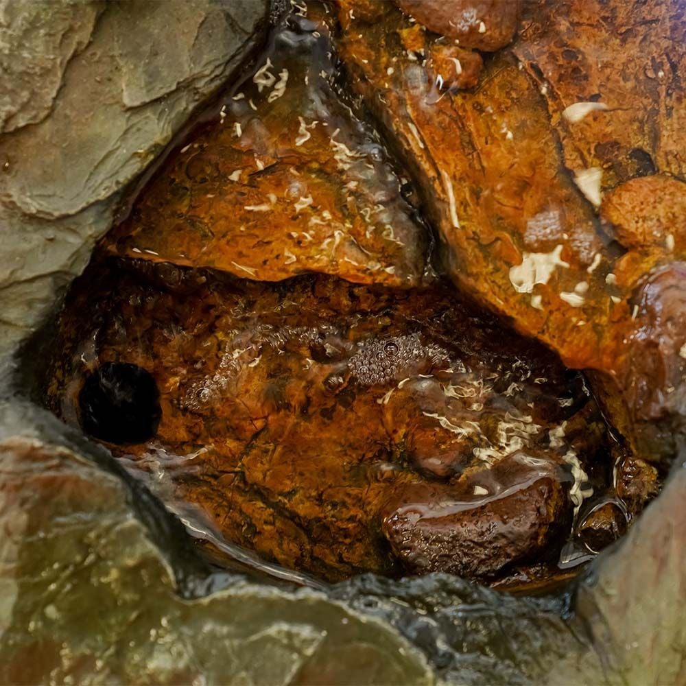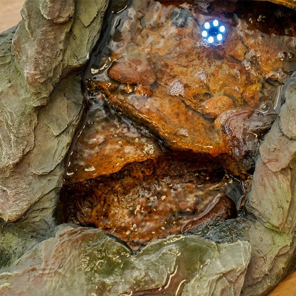 - Bring the tranquil ambiance of a mountain stream right to your outdoor space. Made from polyresin resembling natural stone, the fountain is durable. The LED lights in the fountain tiers accent the movement of the trickling water for a subtle illuminated reflection. It comes with a one-year warranty. Let the gentle sounds of cascading water and the soft glow of lights bring serenity and relaxation to your own backyard.