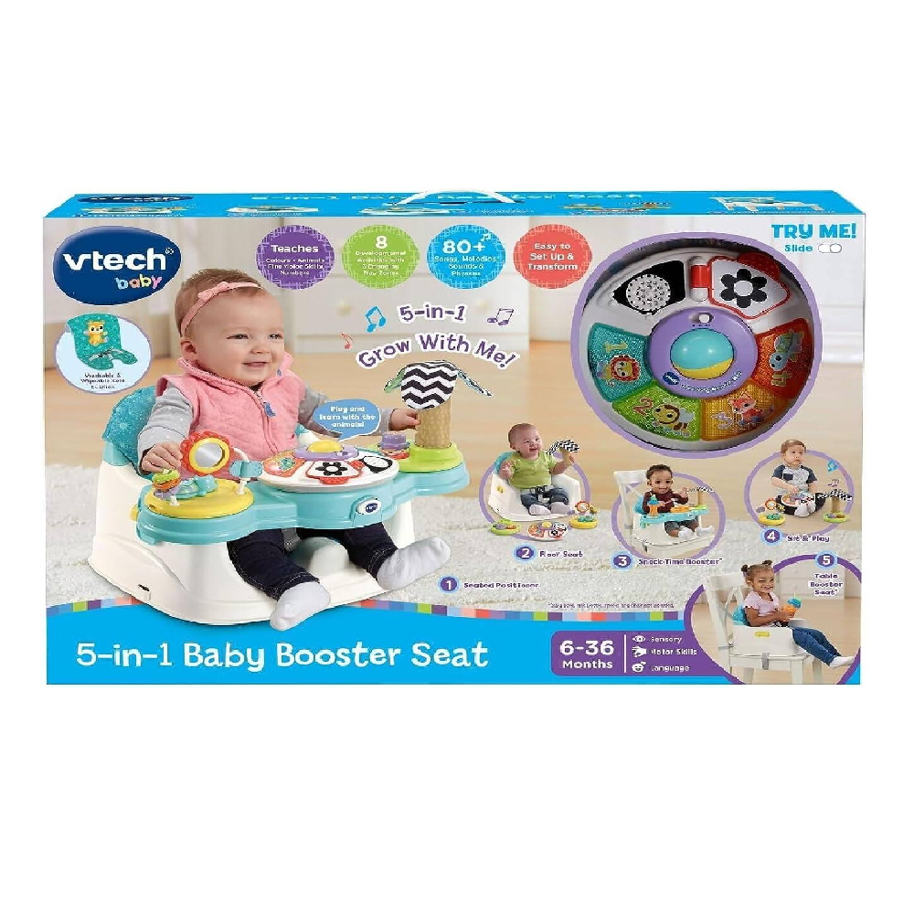 Take a seat and explore with your animal friends! Join your animal friends on the 5-in-1 Baby Booster Seat. Filled with developmental activities with 3 detachable play zones, this seat grows with your baby in their first three years. Features 5 modes including seated positioner, floor seat, snack time booster, sit & play and table booster seat. Develop fine motor skills & tactile stimulation with a twisting mirror, sliding turtle, turning cogs and crinkle fabrics. Includes Musical Play Zone featuring interactive buttons, a rollerball and a turning flashcard. 3-Point Restraint System comes with a secure chair and seat harness to keep baby safe. Includes 5 sing-along songs & 16 melodies.