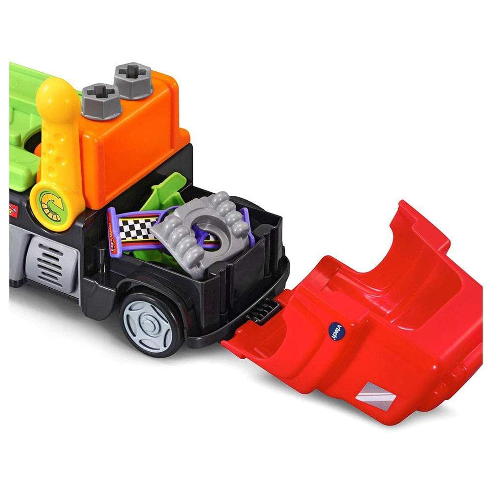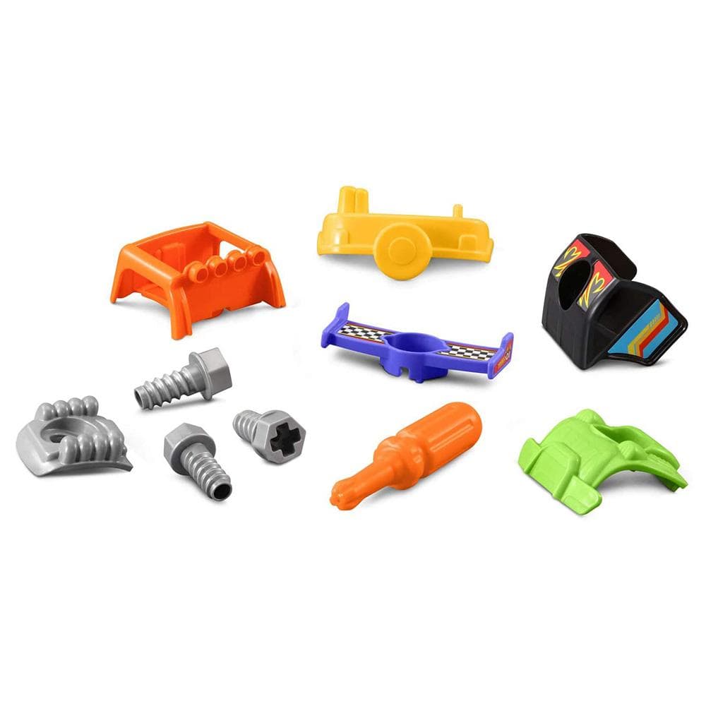Customize a cool race car with the Repair and Race Truck! Learn about colors, car vocabulary, and road safety with the interactive tow truck and race car. The tow truck and car talk to each other like buddies while your child does repairs and customizes the car with 20+ accessories. Pick up the play screwdriver and screws to attach a hood, wheels, an engine, a roof, and a spoiler to make a cool race car! Create a custom car in Explore mode or switch gears to follow repair instructions in Challenge mode.
