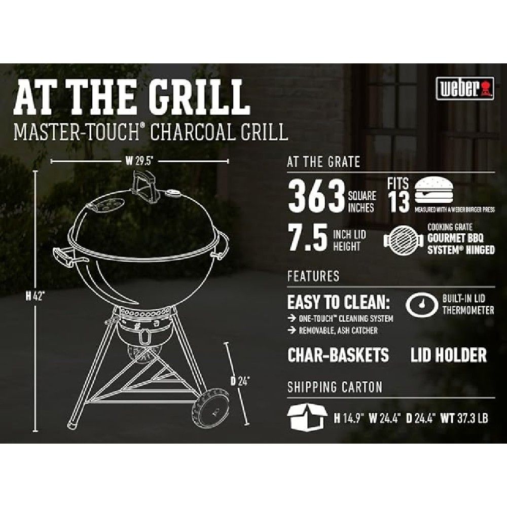 The Weber® Master-Touch Charcoal Grill 22" is equipped with a built-in thermometer for precise temperature control. With this feature, you can easily monitor and adjust the cooking temperature, ensuring perfectly cooked meals every time. Enjoy the convenience and control of this expertly designed grill.